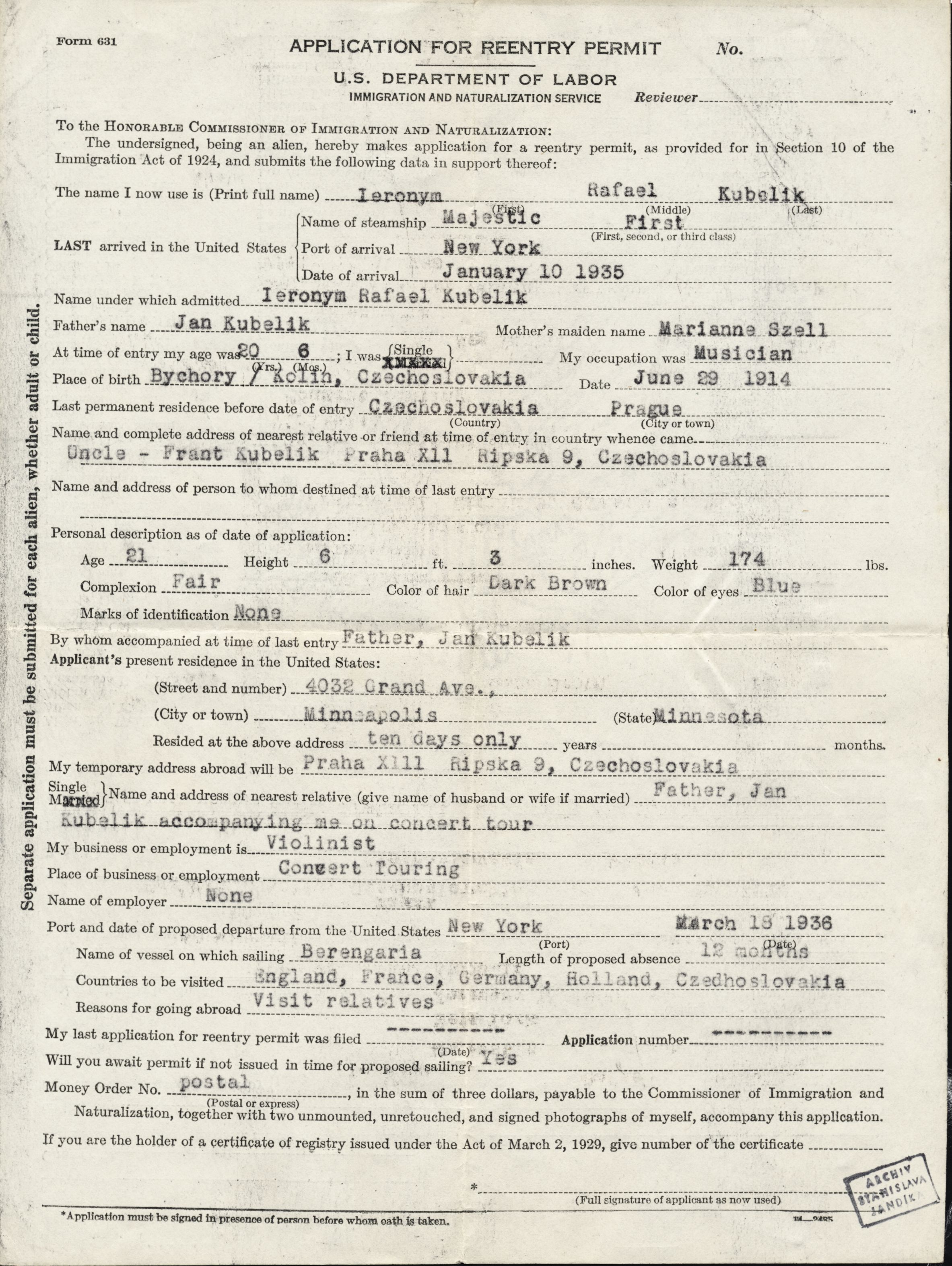Žádost o povolení ke znovuvstupu do USA pro Rafaela Kubelíka, zřejmě žádost o návrat po opuštění USA,popis Rafaelových parametrů, datum: 18. 3. 1932
