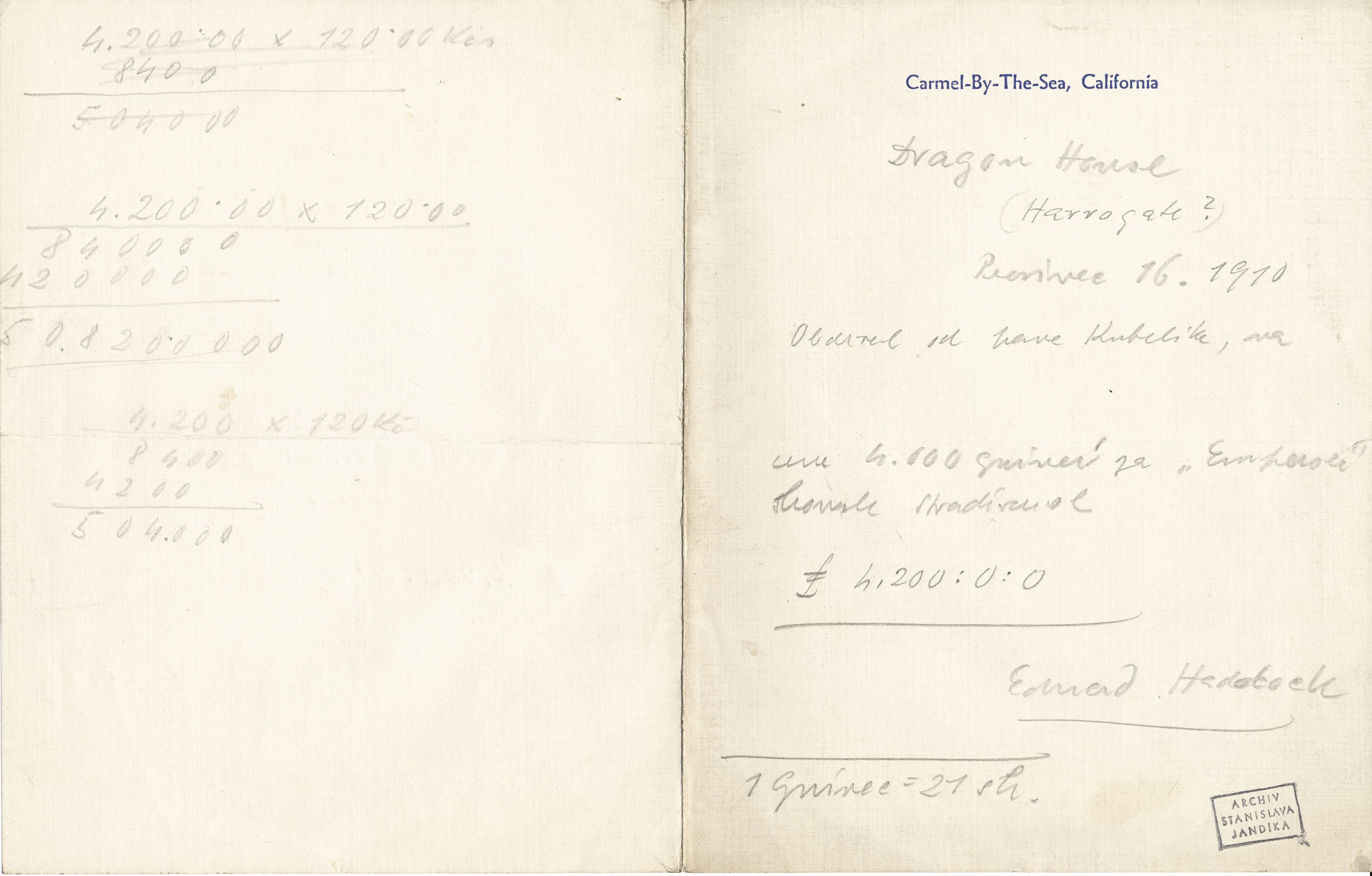 opis potvrzenky na nákup stadivárek, podepsán Eduard Hancock, datum: 15. 12. 1906