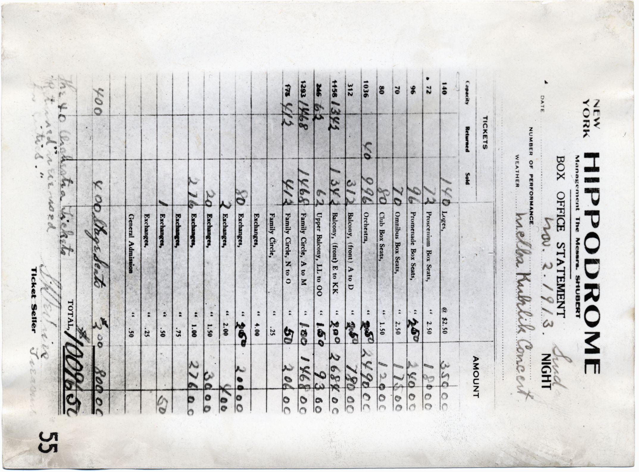 Vyúčtování Hipodromu New York, koncert Melba Kubelík, prodej vstupenek, datum: 1. 11. 1909