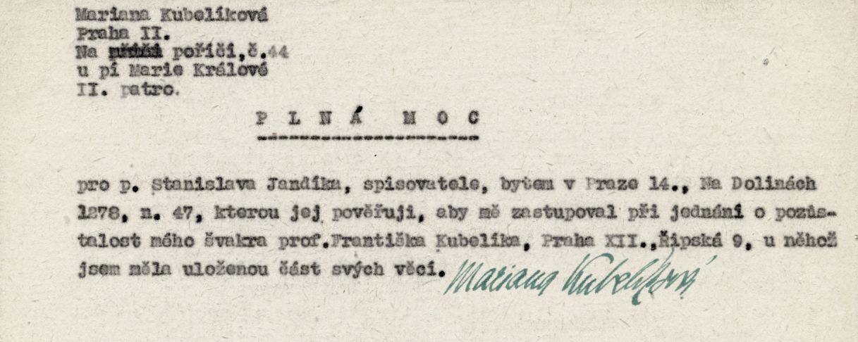 Plná moc Marianny Kubelíkové pro Stanislava Jandíka k vyřízení pozůstalosti prof. Františka Kubelíka, u kterého měla uloženou část svých věcí.