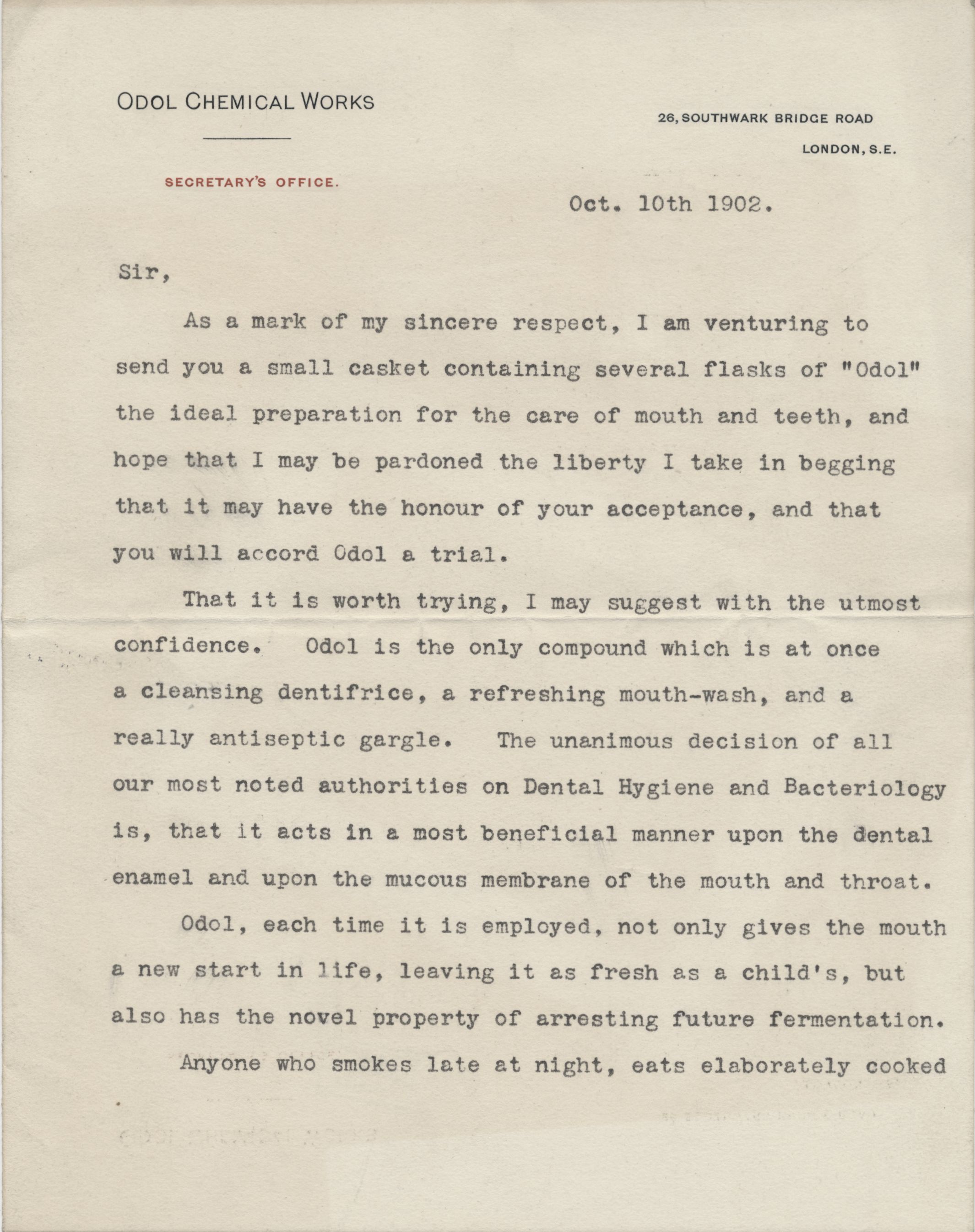 Průvodní dopis k zásilce ústní vody Odol Janu Kubelíkovi